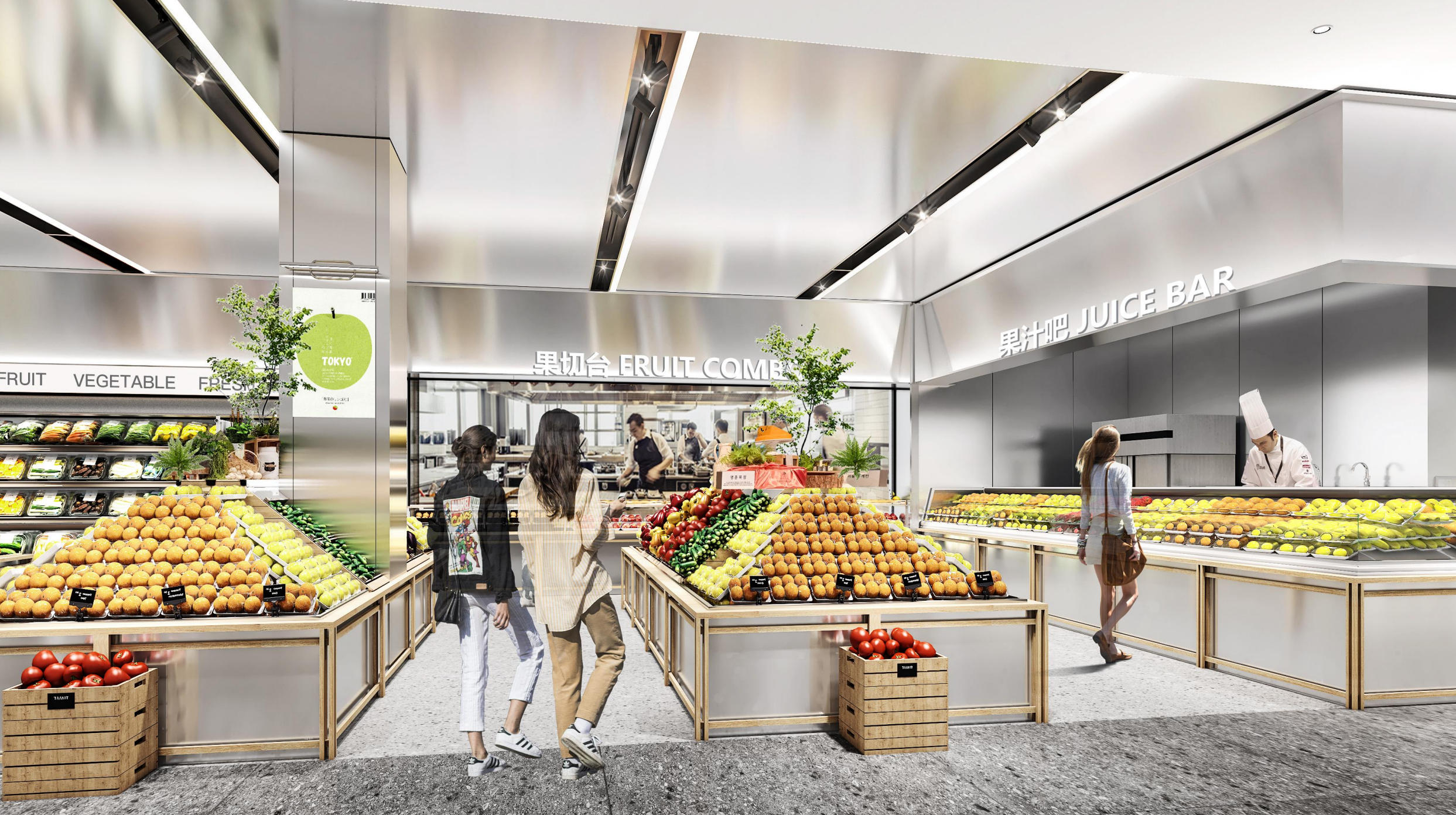 Fresh space: Future, Fresh, Inclusive, Bright, Friendly vs traditional malls. High ceilings: 3D space; silver aluminum, gray terrazzo, white base (restrained) center on products. Greenery softens futuristic materials (tech+comfort). It lifts stay time/joy; "Bg weak, products bold" makes ingredients pop, boosting desire.