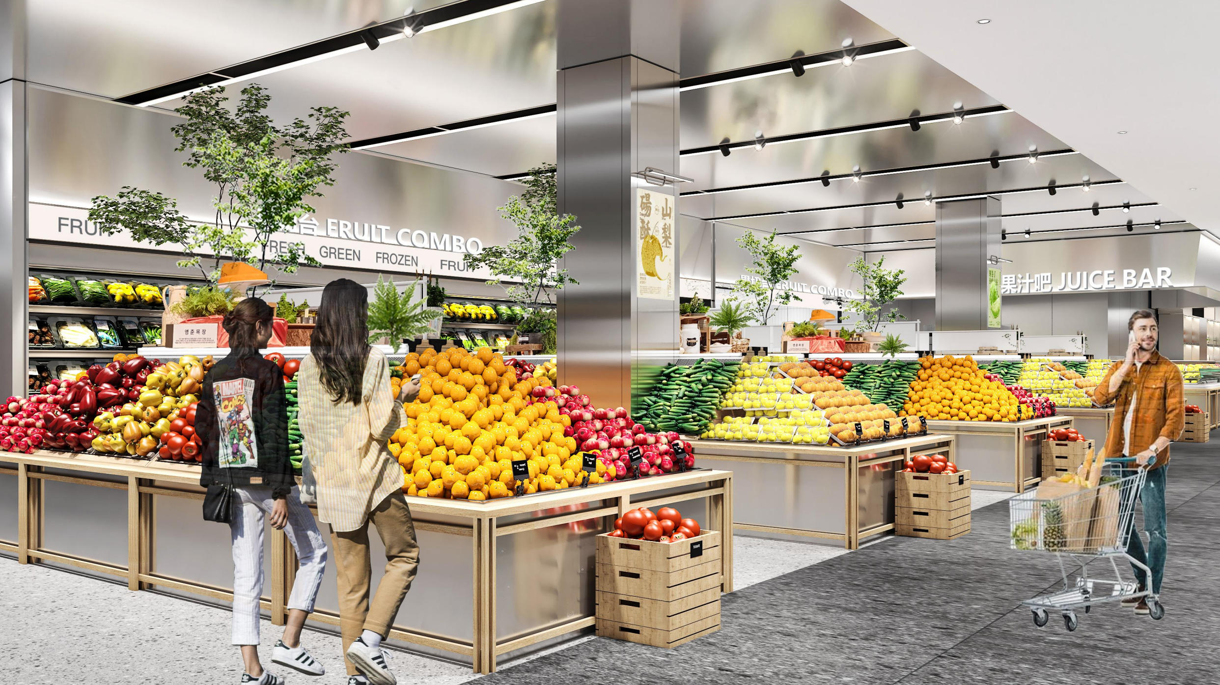"Simple Beauty" as keynote, "freshness" as core: Kaiping’s multiculture blends into fresh food space with aluminum and nature, a bright, clean, open-welcoming space. Restrained materials, precise lighting, smooth circulation make products visual focus. Customers get a trustworthy, visual, vibrant shopping experience comfortably, reflecting Simple Beauty & freshness.